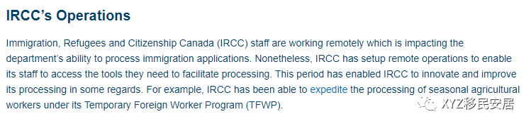 由于IRCC的员工们正在进行远程办公,所以导致有些相关的移民部门没办法较好的完成工作职能去处理移民申请。尽管如此,IRCC还是为远程办公增添了很多权限,能够帮助某些移民案件加快审理过程。比如申请Temporary Foreign Worker Program (TFWP)的季节性农业工人签证。