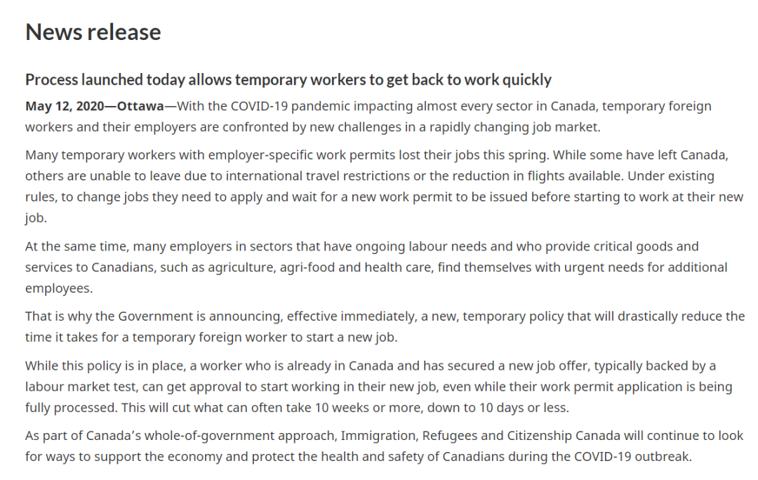2020年5月12日,加拿大移民局宣布为雇主提供帮助,以满足其劳动力需求。今天启动程序提速临时工签审批,使外劳可以快速恢复工作。