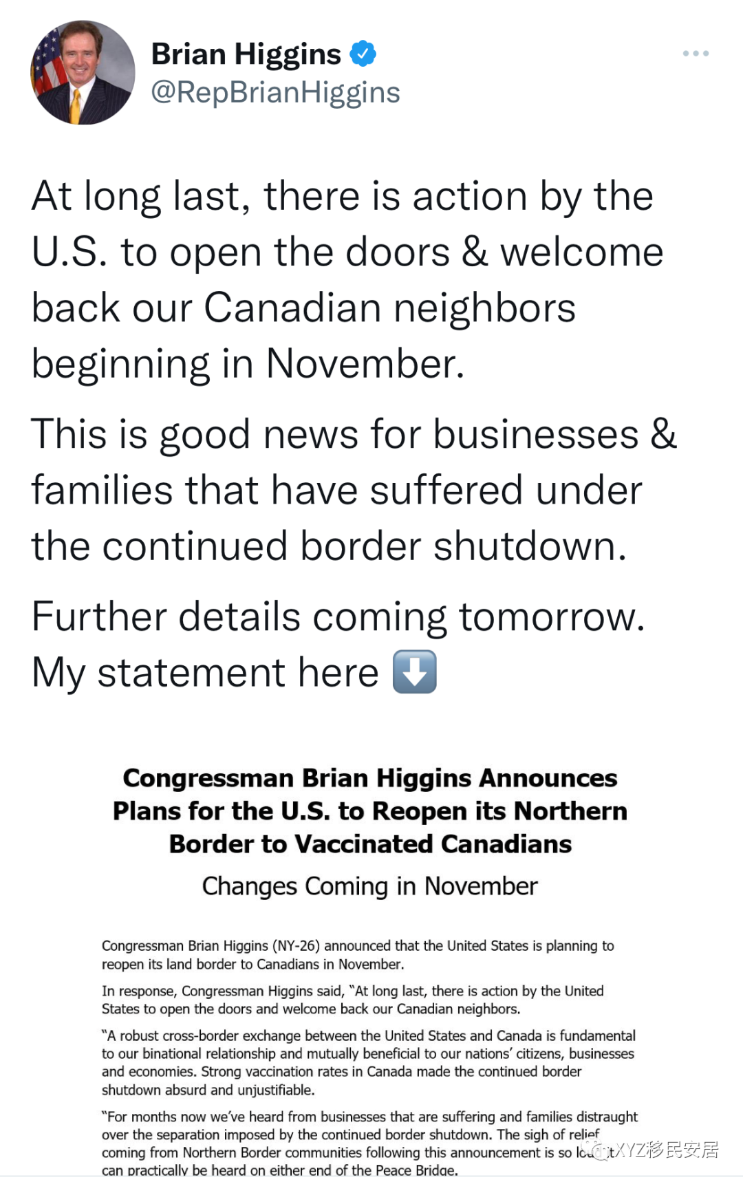 这一消息最初是由美国国会议员布莱恩·希金斯于昨天(10月12日)在推特上发表声明,随后得到了国土安全部部长的确认,但目前还没有给出陆地边境重开的确切日期。