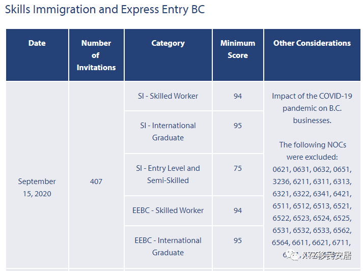 不列颠哥伦比亚省通过2020年9月15日举行的省提名计划抽签邀请了407名移民候选人。