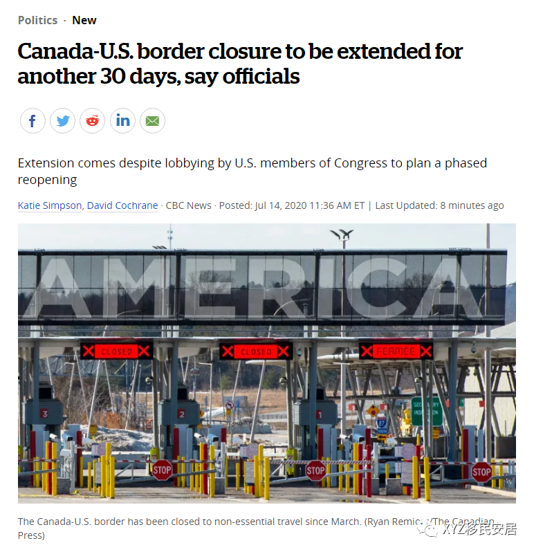 加美边境关闭再延长30天!