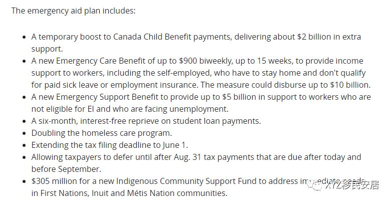3.失业福利:除原有的失业保险EI之外,对失业或者工作时间缩短的工作者追加50亿资金支持;