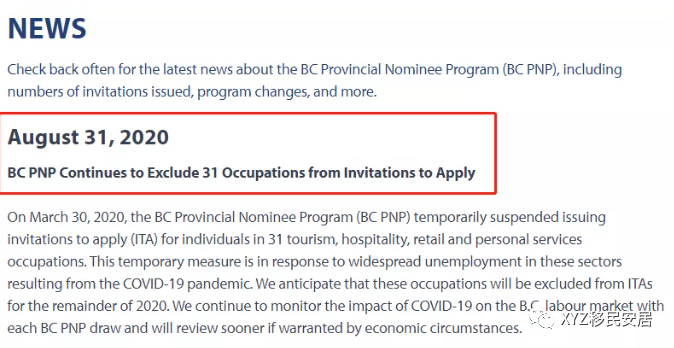 BC省提名办公室于8月31日发布最新通知:BCPNP将在今年剩余的时间里持续暂停对下述31个旅游、接待、零售和个人服务行业的申请人发放邀请函(ITA).