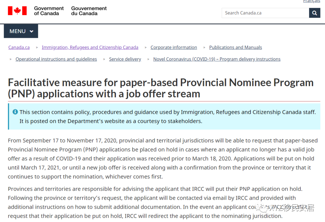 移民局暂停部分省提名申请 加拿大各省的省提名办公室将会对那些因为疫情失去工作,且在2020年3月18日之前递交申请的省提名申请人暂停审批(on hold in cases),各省彻查本省申请人的工作状态时间为2020年9月17日至2020年11月17日。