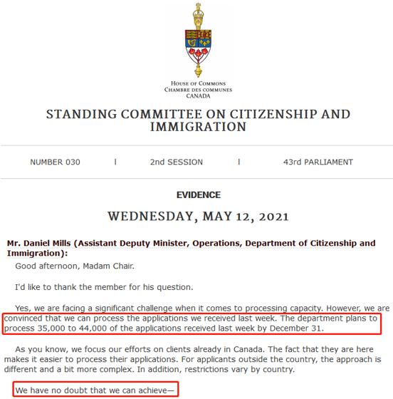 加拿大移民部助理副部长Daniel Mills在国会发言称,将在今年12月31日之前处理完5月6日New Pathway的3.5万到4.4万份移民申请,并且表示将会非常有信心做到!