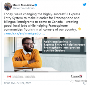 加拿大移民部长马可·门迪奇诺(Marco Mendicino)宣布,会说法语和双语的候选人将在EE通道中获得更多加分。