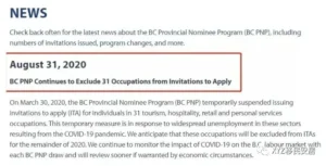 BC省提名办公室于8月31日发布最新通知:BCPNP将在今年剩余的时间里持续暂停对下述31个旅游、接待、零售和个人服务行业的申请人发放邀请函(ITA).