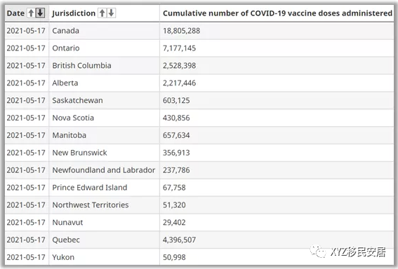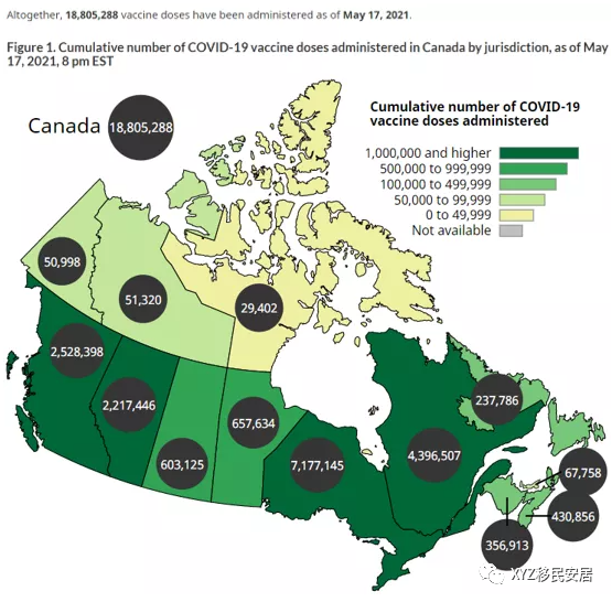 据加拿大卫生部门的最新报道显示,截至2021年5月17日,加拿大全国已接种Covid-19疫苗18,805,288支。其中安省已接种疫苗数量最多,已超过700万支,其次为魁省已超过400万支,BC省、阿尔伯塔省接种疫苗数量也超过了200万支。