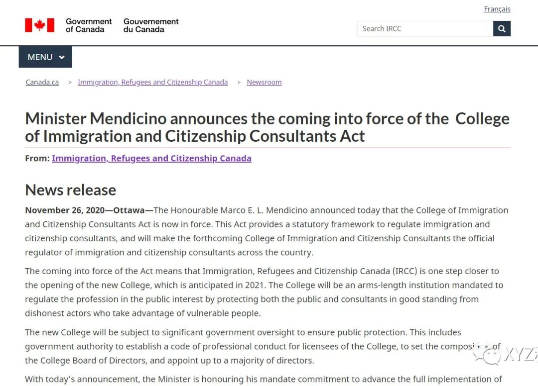 移民部部长门迪奇诺于2020年11月26日宣布”the College of Immigration and Citizenship Consultants Act” (持牌移民顾问学院法)生效。