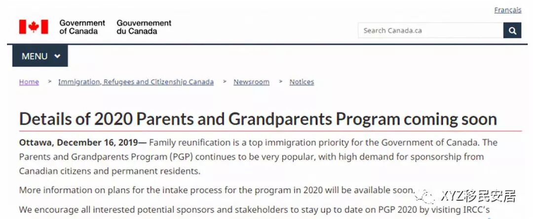12月16日,加拿大联邦移民局更新了父母团聚移民的最新消息:2020年度父母团聚移民(Parents and Grandparents Program)即将开放! 但截至发稿时,仍未有最新细则。