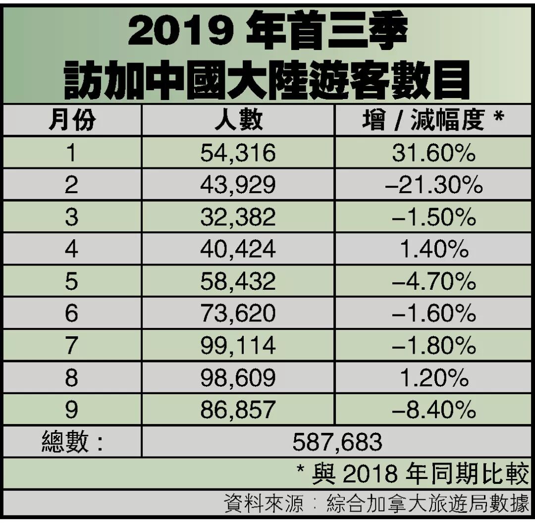 旅游局指出,今年由于全球贸易之间的摩擦及经济放缓,或许导致消费者产生不明朗态度。再加上早前孟晚舟事件 引发中加关系略显紧张,两方更是于今年年初先后互发旅游警示。