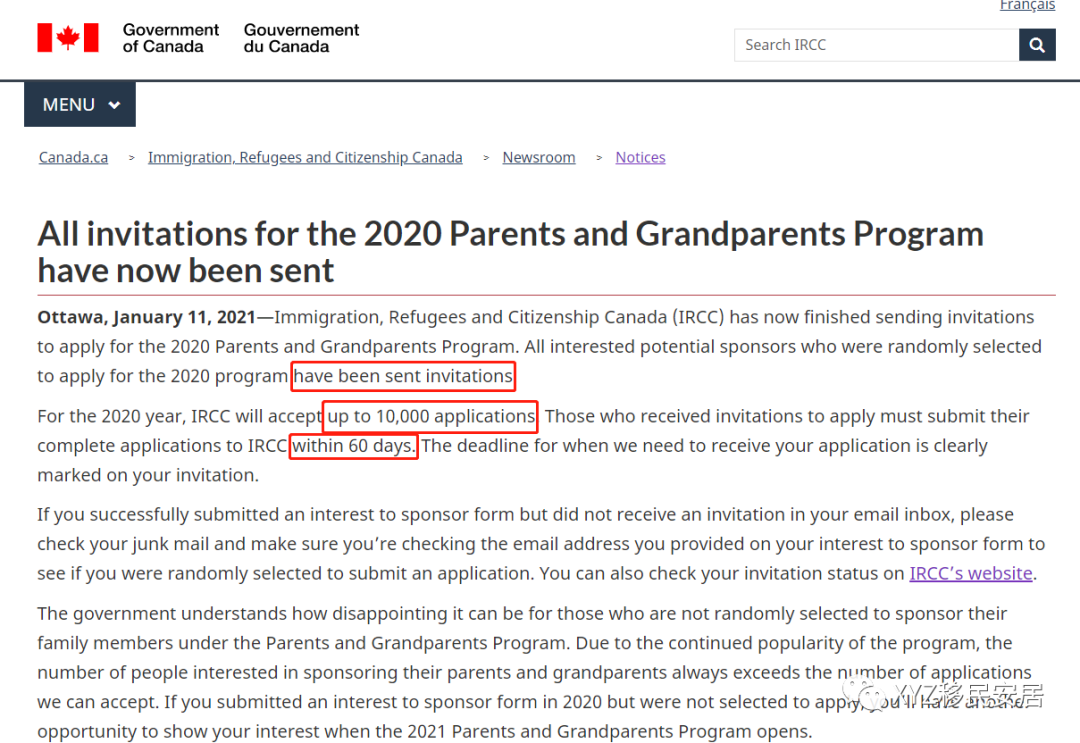 2020年父母团聚移民抽签已于昨日(2021-01-11)结束,IRCC已经向被随机抽中的担保人(sponsors)发出邀请,收到邀请的担保人将会按照IRCC发送的邀请指引在60天内递交父母/祖父母的移民申请。