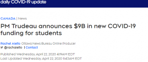 为了关爱受新冠疫情影响的学生,联邦政府决定发布加拿大紧急学生救助金(Canada Emergency Student Benefit,简称CESB),共将拨款$90亿。联邦政府表示,符合以下几种情况的大学生,可以从5月份开始至8月份,申请每个月1250加币的补助